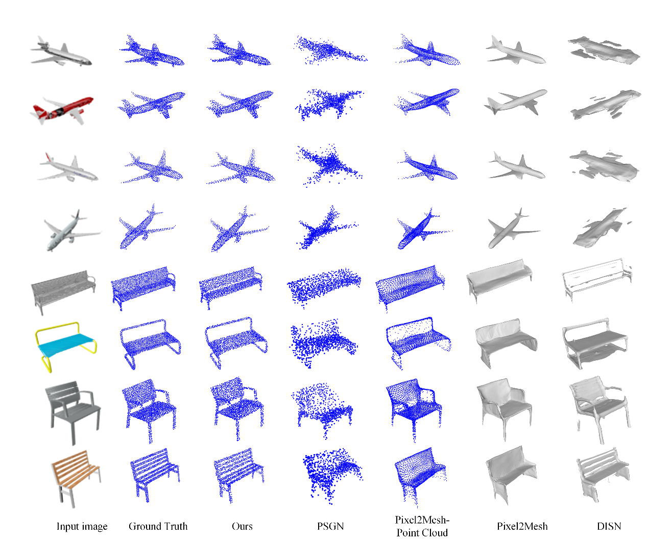 在Airplane和Bench数据集上,与PSGN,VGG-Pixel2Mesh和DISN这3种方法进行对比,结果如图2所示。可以看出,本文方法在Airplane数据集上的重建结果与VGG-Pixel2Mesh相近,优于其他2种方法,均取得较好的重建效果。但本文方法重建结果的噪声更少,点云分布更加均匀,更加贴近真实形状;在有孔洞的Bench模型上,本文方法的重建结果明显优于其他方法,证明该方法具有较好的鲁棒性。
