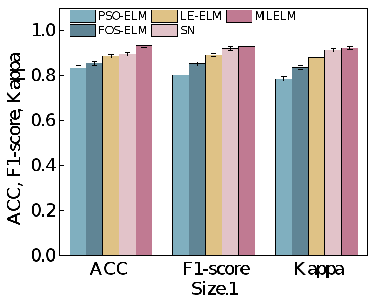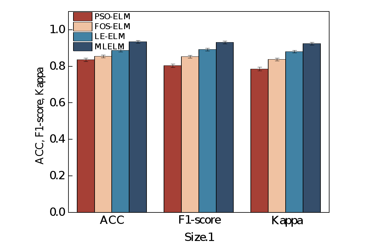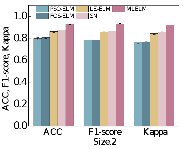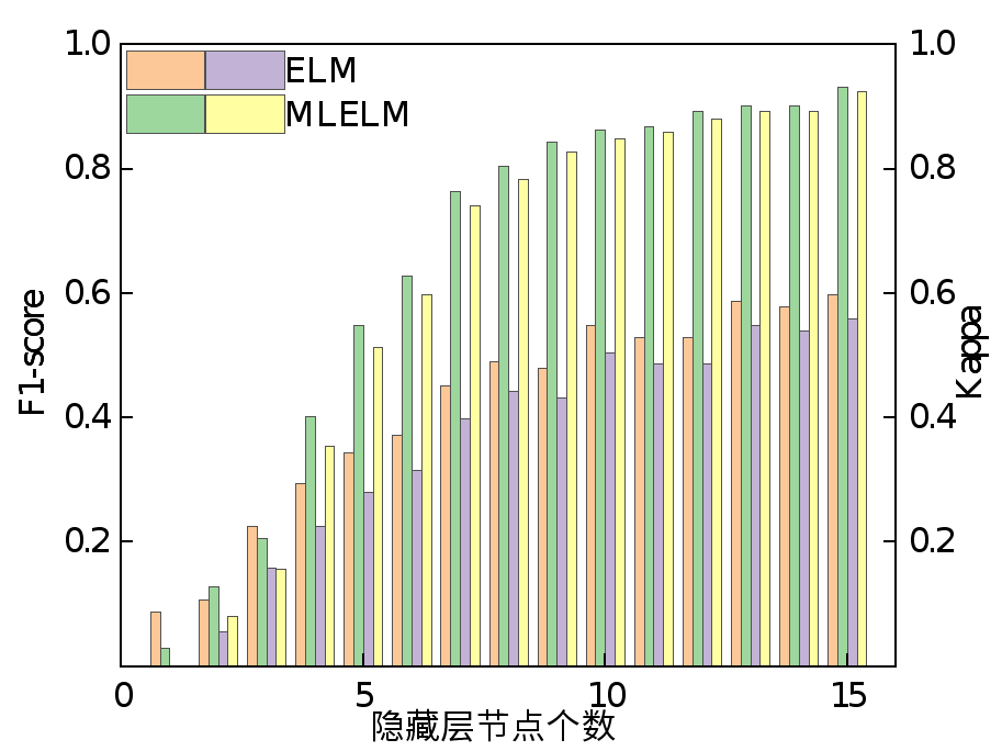 MLELM与ELM在电潜泵稀缺故障样本数据集上评判指标与运行时长对比如图2-图3和表2所示