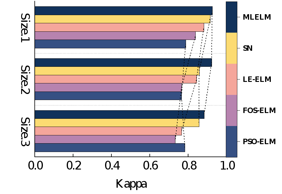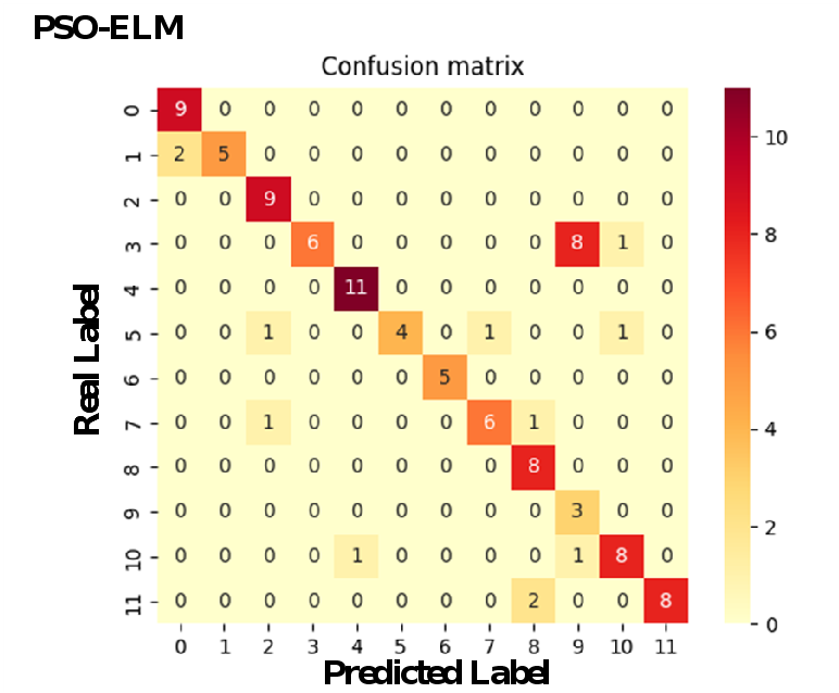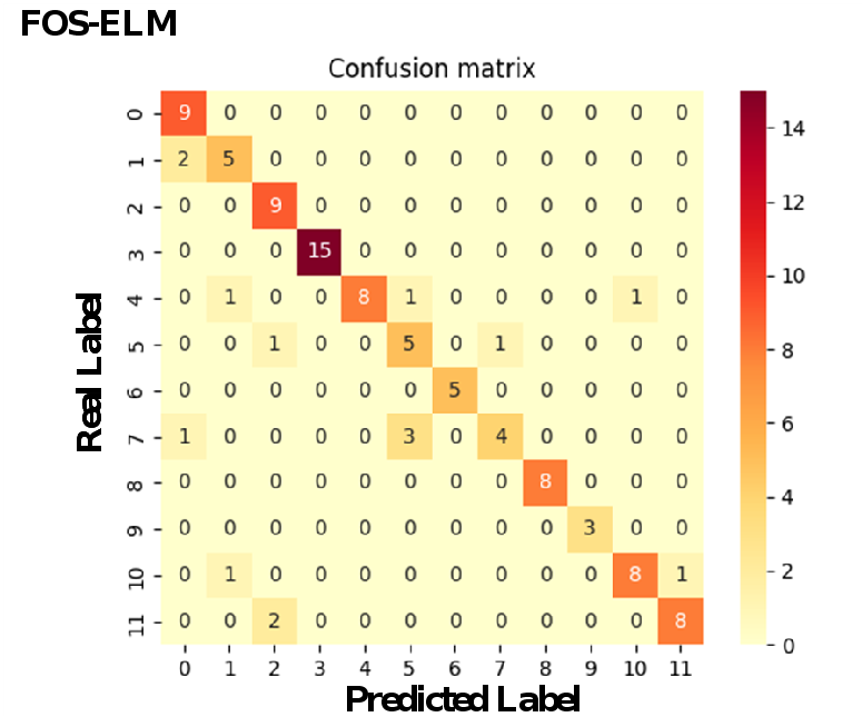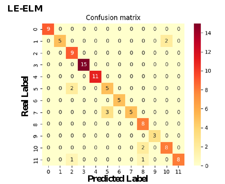 分类结果的混淆矩阵如图5所示。可以看出,在处理稀缺故障样本问题时,MLELM在12种电潜泵故障类别的综合准确率要平均高出其他三种改进ELM算法8%左右,F1-score要高出0.8分左右,KAPPA要高出0.9分左右。在总12种类型中,全部都分对的类型有7种,并有10种类型的准确率和8种F1-score得分高于其余三种算法。