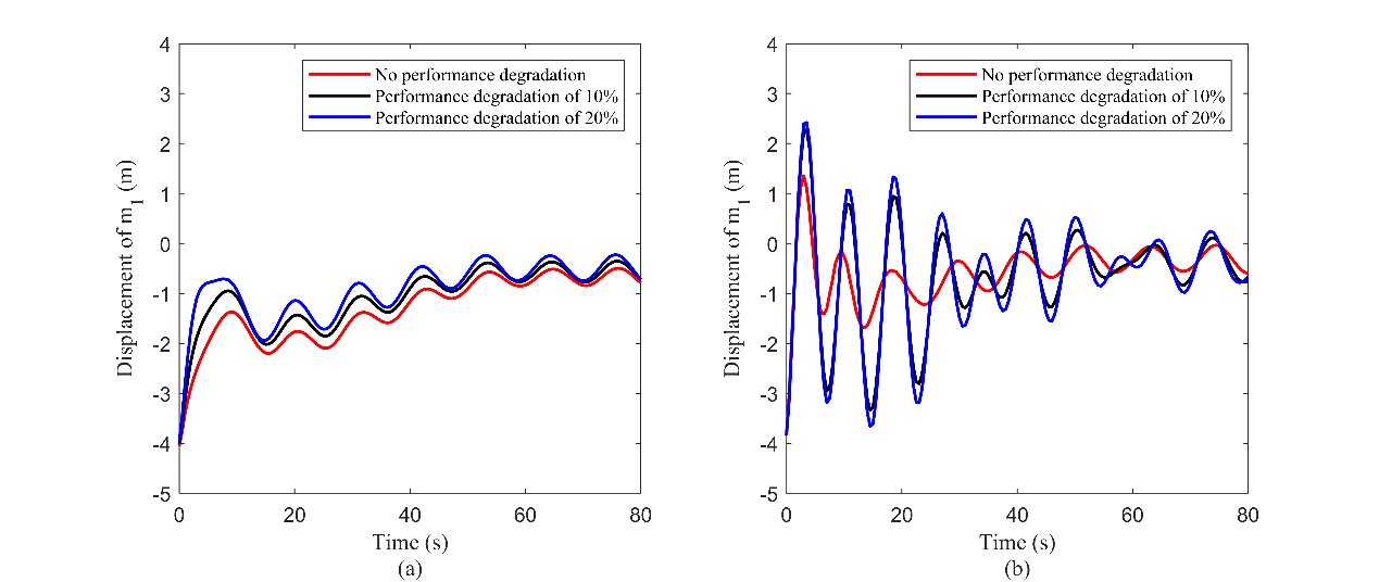 图4 张紧器不同机械性能时质量块一DRHGPC和LQR控制效果对比