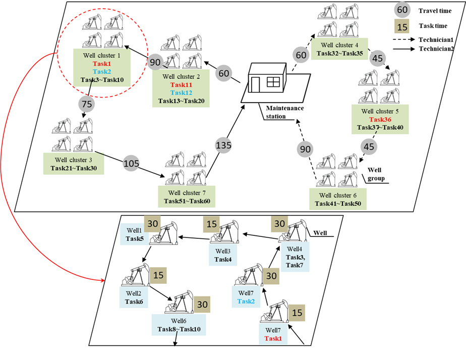 设备维护是油气井现场日常运行管理的重要组成部分,对保证油气井安全、盈利的生产运行起着至关重要的作用。高效的维护和管理可以提高生产效率、安全性和降低运营成本。面对不同地点和优先级的任务,确定每个技术人员的最佳任务顺序以提高整体效率至关重要。