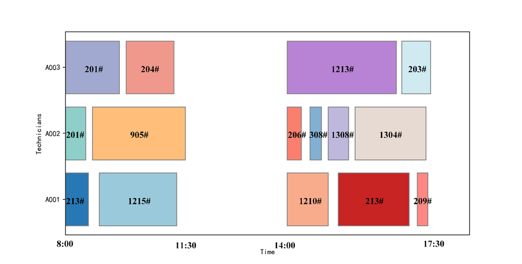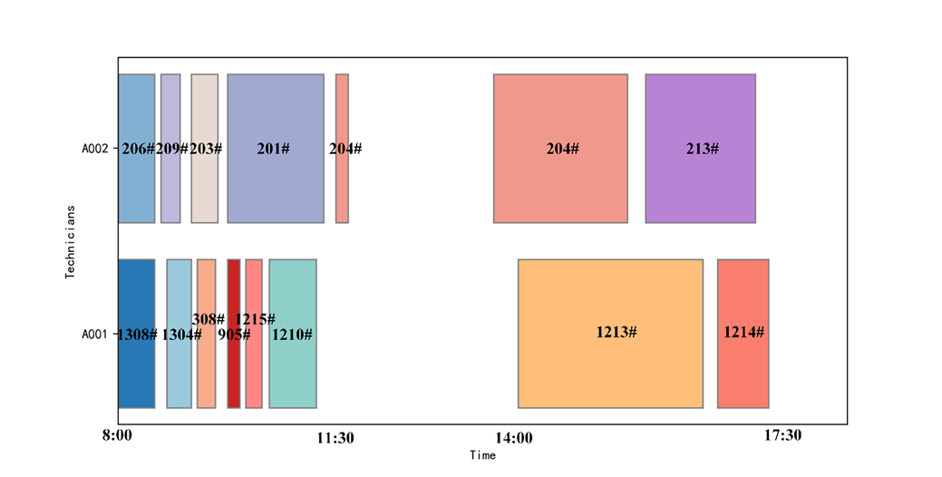 每位技术人员的工作时间为上午8:00-12:00,午休后13:30-17:30。定义为优先级为1和2的任务调度完成后可以调度的预留时间,用于执行优先级为3的任务。