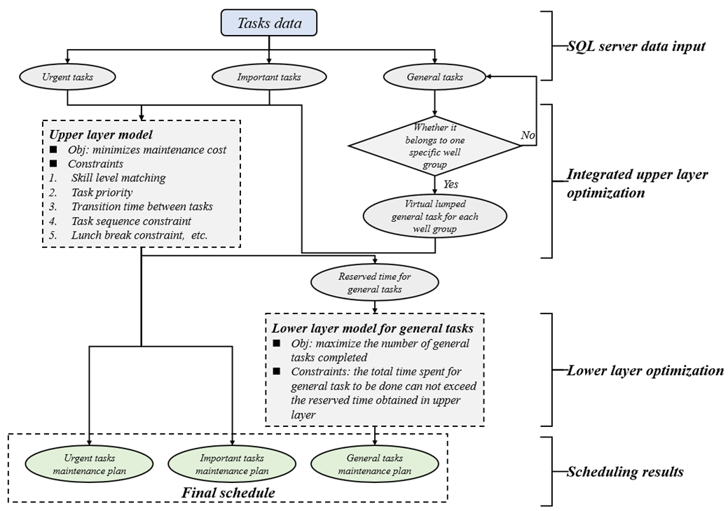 及时有效的维修调度是油气田安全稳定运行的关键。具有多个优先级的大规模维修任务很难在可接受的时间内完成。为了加快计算速度,提出了一种两层策略。在上层,为每个井簇生成一个集总任务。这种集总允许上层模型集中在紧急和重要的任务上,从而可以得到一个显著减少规模的混合整数线性规划(MILP)模型,以确定每个技术人员的调度和分配的时间长度。在底层,以上层预留时间为约束,为每个技术人员建立小规模的MILP模型。结果表明,我们的方法在效率上明显优于完整的MILP模型。通过我们与业界的合作,该方法目前正在现实场景中实施。