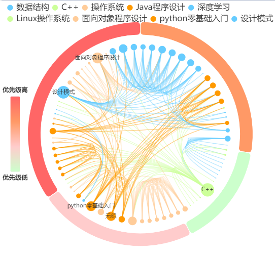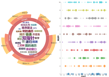 根据学生的编程行为画像为其推荐适合的编程题目如图7所示,可以根据词云图了解薄弱知识点,根据单轴气泡图选择适合难度题目进行练习。进而系统为其提供多门课程按照学习优先级展示在外层圆环上,如图8所示,根据课程节点之间的连接关系,可以确定某些课程的前置课程进行学习,更好的理解课程知识点。