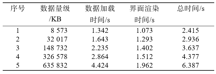 本文使用不同量级的数据对系统的响应速度进行测试,在AMD Ryzen 7 4800H with Radeon Graphics设备上进行实验。实验结果如表2所示,可以看出系统响应主要受数据加载的影响,不同量级数据的界面渲染时间相当。随着数据量增多,数据加载时间越长,但界面渲染响应都不超过2s。