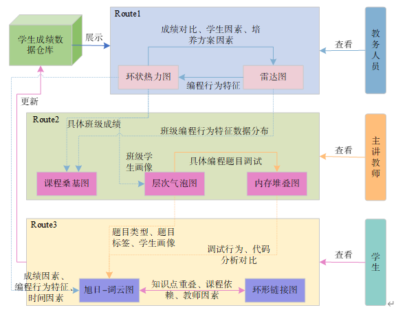 以编程和调试行为作为切入点对计算机专业教学过程进行多角度分析,对于优化培养计划、辅助教师教学内容设计和全面提升学生的编程能力具有重要的意义。在对各高校CG和OJ平台进行调研后,我们发现对于编程和调试协同可视分析的研究较少,并且上述平台的算法编程与调试数据分析处理中存在以下问题:(1)难以有效探索学生成绩、作业及考试题目和编程与调试行为之间的关系;(2)难以有效挖掘大规模学生编程调试数据中的隐含信息。