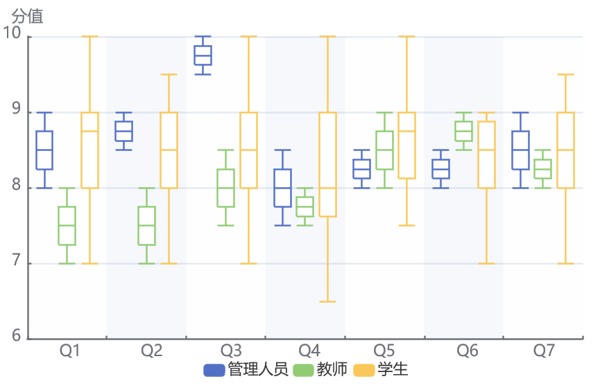 表1给出了视图因素方差分析的结果,因变量为信息匹配度,检验统计量F的值为3.163,P值为0.008小于显著水平0.05,因此拒绝原假设。说明不同视图在准确率上存在显著性差异。另外图9展示了测试者对相应任务的主观打分,可以看出只有Q4任务的得分较低,其他任务都能获得较高的评分,这表明系统是用户有好的,具有很好的可用性。