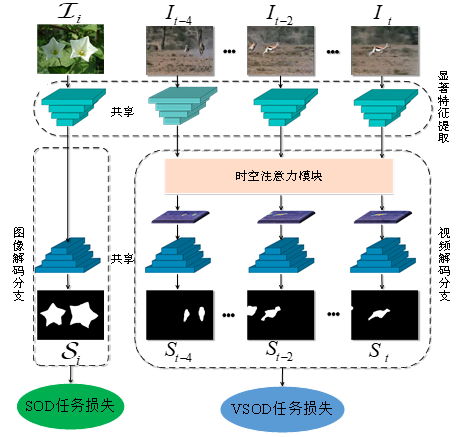 模型通过联合优化图像及视频显著目标检测任务的方式进行训练,并最大限度地共享任务间相关知识。包含对显著特征提取模块、时空注意力模块、解码模块。