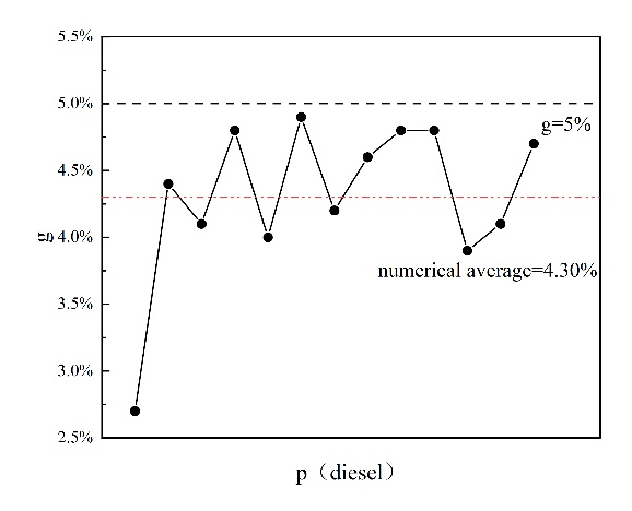 从图3和图4可以看出,当我们改变设定值 g 的大小时,目标馏分中优化后调和原油的收率差距仍然保持在设定的范围内,这进一步证明了我们提出的优化模型能够确保调和原油在设定的范围内保持动态稳定,从而提高调和原油性质的稳定性以满足后续生产要求。