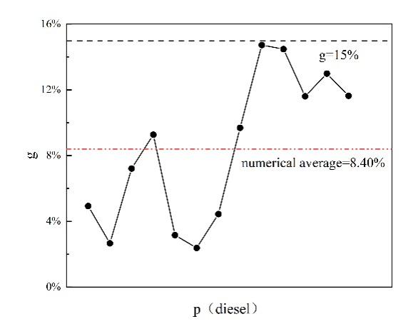 图3. 当 g=5%时,目标馏分中调和原油的收率差距