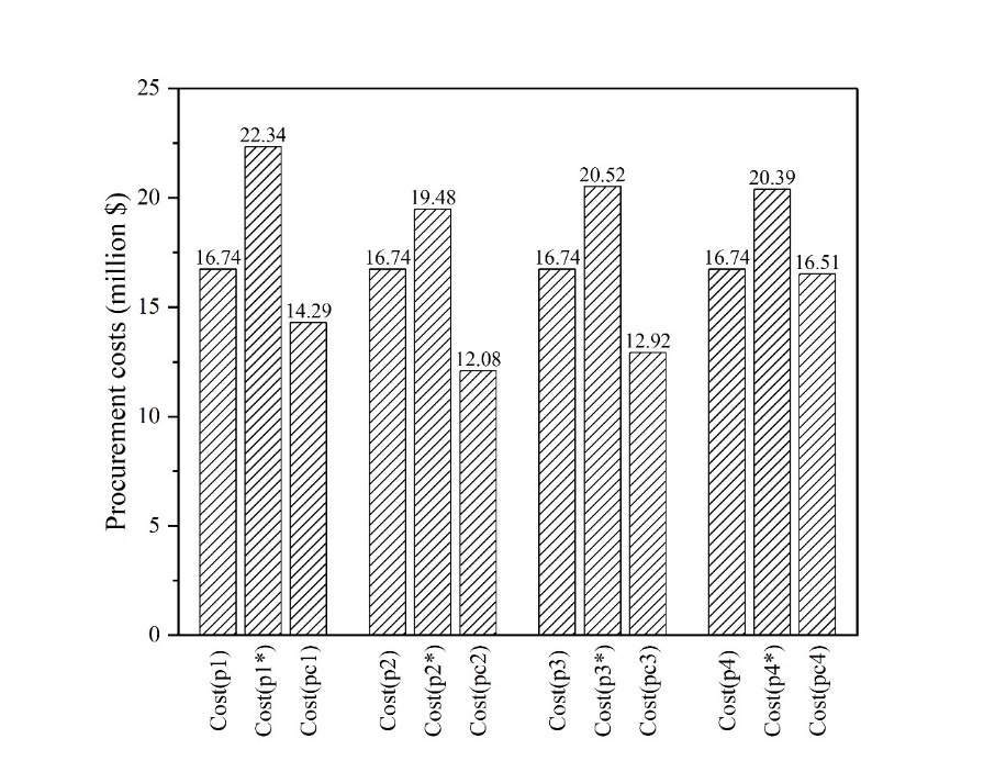 虽然较小的设定值 g 能够使实际过程中调和原油的性质更加稳定,但仅关注调和原油性质的稳定性是不够的;模型还需要考虑原油采购的成本。当设定差距值 g = 15% 时,案例1-4的原油采购成本如图5所示。