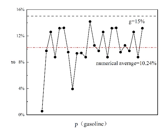通过分析具有不同设定差距值 g 的原油调和方案,当设定差距值 g = 5% 时,参与调和的原油种类较少,大多数原油调和方案仅根据实时原油购买价格调整不同原油类型在调和过程中的比例,很少替换新的原油类型。在这种情况下,调和原油的性质波动最小且最稳定。当设定差距值 g = 15% 时,参与调和的原油种类明显多于 g = 5% 的情况。原油调和方案频繁调整,参与调和过程的原油种类和比例不断变化,调和原油的性质在一定范围内频繁波动。在 g=25% 时,参与调和过程的原油种类略多于 g=15% 的情况,但原油调和方案的变动更大,即不同调和方案的变动更多,原油种类和比例的变动也更多,导致调和原油性质的波动最为显著。这表明,我们可以通过调整设定值 g 的大小来影响调和原油性质的波动范围,从而稳定调和原油的性质。设定值 g 越小,性质波动的范围越小,调和原油的性质越稳定。
