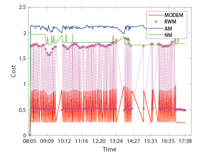 本篇论文采用真实的出租车轨迹数据集进行模拟仿真实验,实验结果如图3所示,结果表明,与其他服务迁移策略相比(即不迁移(NM),总迁移(AM),以随机游走建模用户移动性的迁移策略(RWM)),本篇论文提出的服务迁移方法(MODEM)有很好的性能。