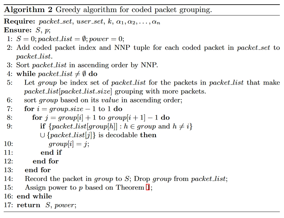 第二阶段为PD-NOMA中的分组与功率分配策略。当所有编码包生成后,基站将基于PD-NOMA对其进行调度并分配传输功率。即使在给定待传输的数据包的情况下,最小化传输时延仍可能是一个困难的问题。因此,我们提出了一种启发式算法,先对数据包进行分组,然后分配传输功率。