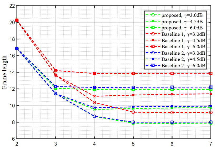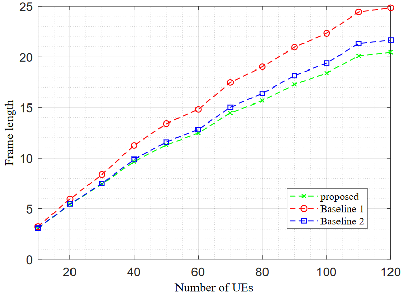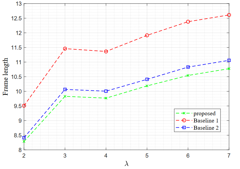 当n = 10时,所提出的算法和baseline1相较于baseline2,分别将帧长度减少了5.03%和4.9%。当n = 70时,这一比例分别上升至17.19%和13.91%。