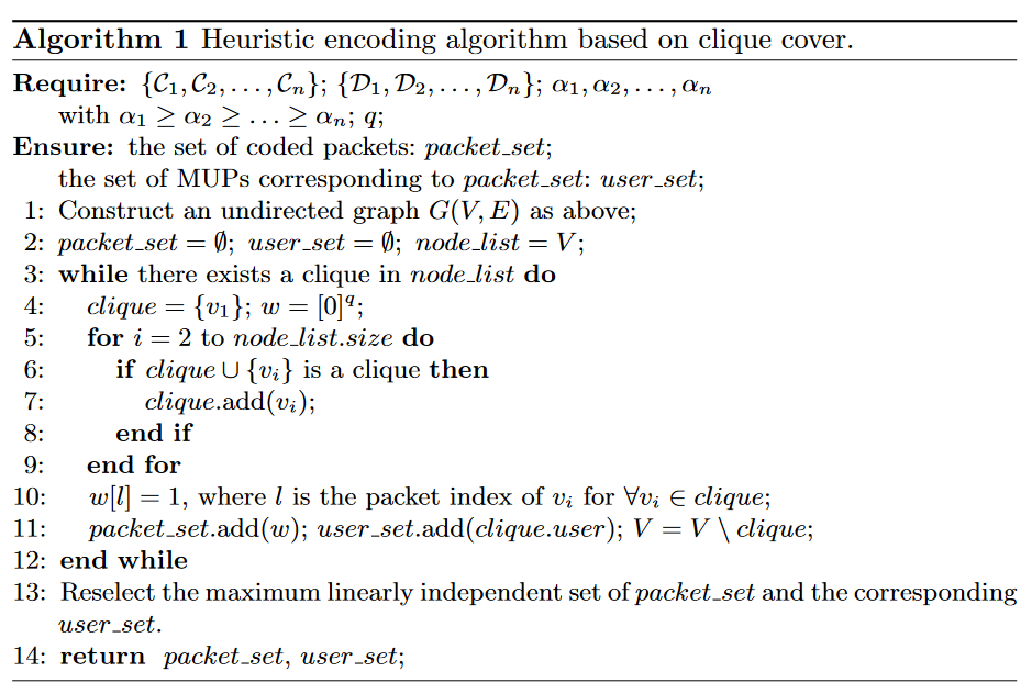 第一阶段为基于团覆盖的编码策略。显然,编码包的数量对传输时延有很大影响。通常,数据包越多,时延越大,反之亦然。因此,我们首先考虑如何通过索引编码减少数据包的数量,同时确保所有文件请求在一个帧内得到满足。因而算法设计如图1所示。