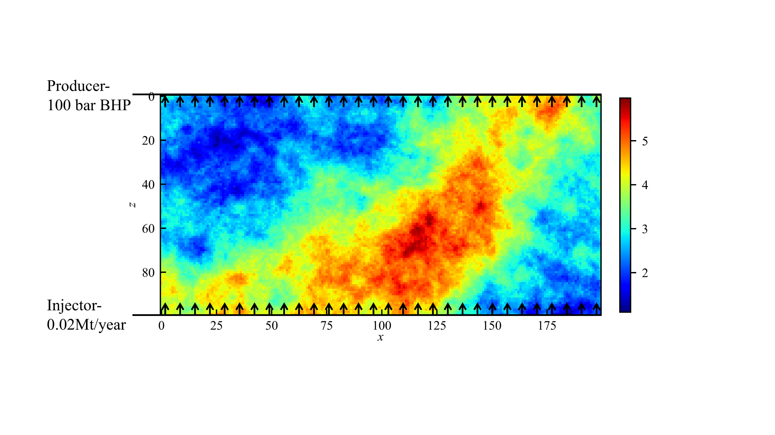 碳捕集与封存(CCS)通过捕集大型排放源(如化石燃料发电站)产生的CO₂,并将其存储于地质构造中,以减少大气中的CO₂排放。数值模拟在预测CO₂在地下环境中的迁移行为以及评估存储效果方面至关重要。但受地层的多尺度非均质性、非线性偏微分方程求解以及多相多物理相互作用的影响,高分辨率模型的计算成本极高。此外,当涉及历史拟合、优化和不确定性分析等任务时,计算量进一步显著增加。因此,常采用尺度升级技术将高分辨率模型转换为等效的低分辨率模型,以降低计算成本。现有的碳封存模型尺度升级方法多采用简单平均法或简化模型(黑油模型),精度有限。本文针对CO2注入咸水层过程,开发了一套适用于全物理模型的尺度升级算法,在加速数值模拟的同时,确保高精度和高鲁棒性。