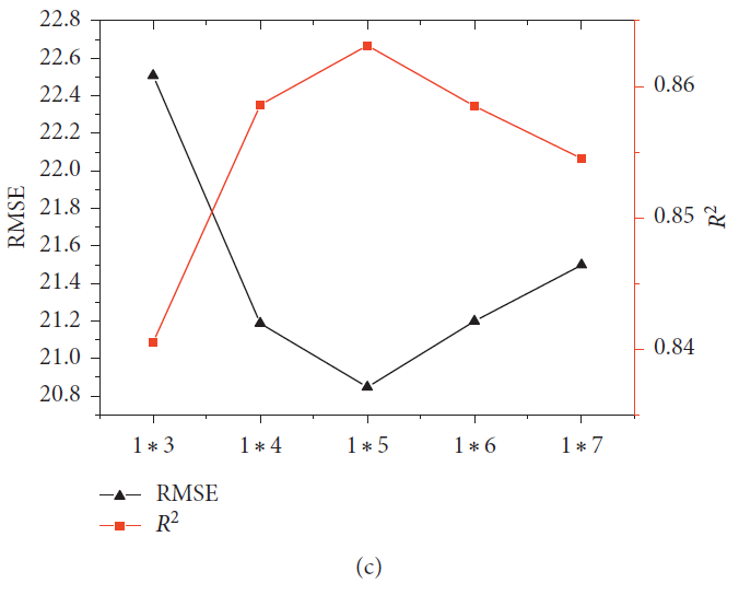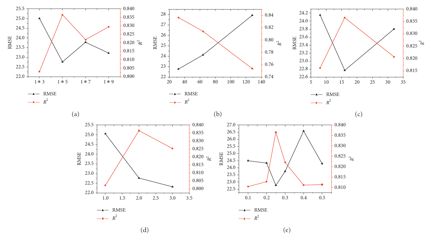 CNN超参数的优化过程中以RMSE和R2为评价指标,优化卷积核的大小和数量以及卷积层数,图2显示了调试超参数的结果。