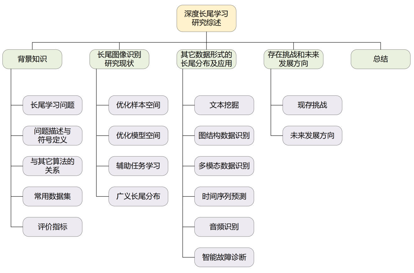本文从深度学习的设计流程出发,构建了一种新的长尾学习分类方法。对于图像识别领域,重采样与数据增强本质上都属于构建信息量更均衡的输入样本空间。优化特征提取器、优化分类器、logits 调整和代价敏感加权损失函数方法旨在优化模型结构或模型参数,属于优化模型空间的方法。在此基础上,解耦学习、度量学习、知识蒸馏、集成学习和层次学习通过引入辅助任务,同时优化多个空间上的任务。此外,广义长尾分布则是从多尺度建模长尾分布。在每个子类中,根据研究动机与实现手段对文献进一步细化归类。此外,本文对文本数据、语音数据等其它数据形式下的长尾学习算法进行简要评述。最后,讨论了目前长尾学习面临的可解释性较差、数据质量较低等挑战,并展望了如多模态长尾学习、半监督长尾学习等未来具有潜力的发展方向。