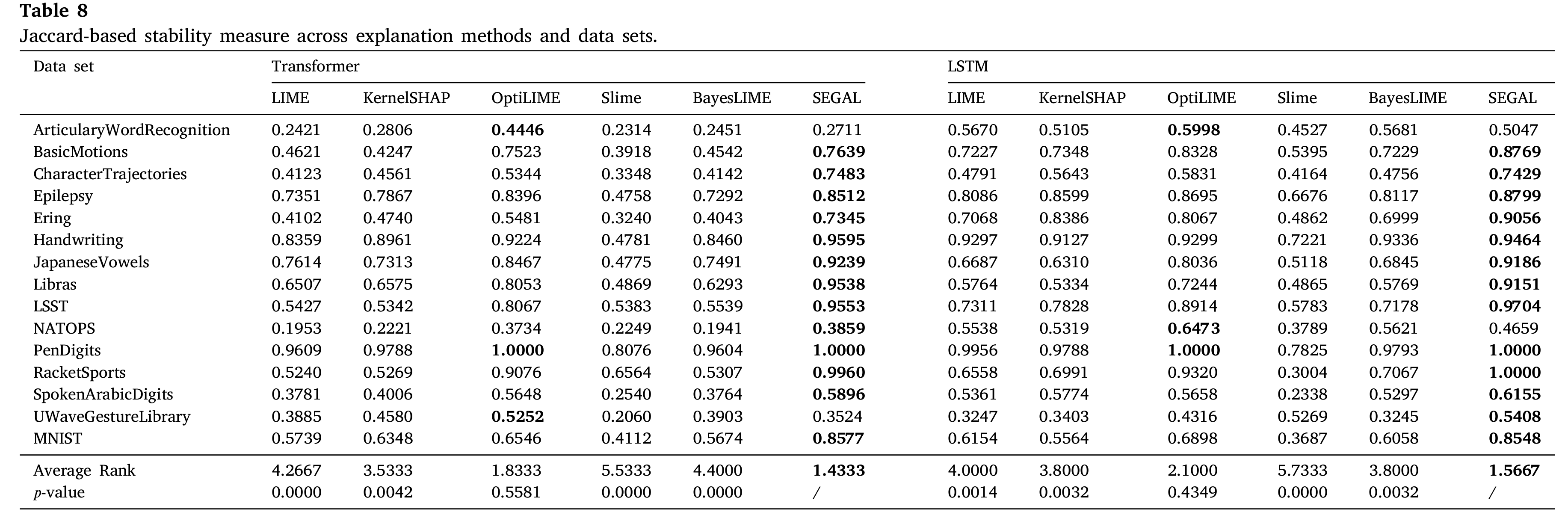 通过与基准方法的比较表明,SEGAL在稳定性评估中表现突出,其解释结果在多个数据集中表现优异。在Jaccard相似性指数的评估中,SEGAL在大部分数据集上都取得了较高的分数,证明了其在生成稳定解释方面的能力。