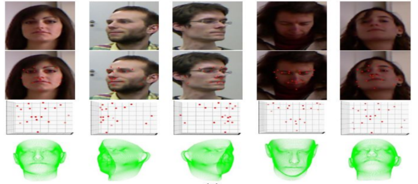 头部姿态估计是计算机视觉的一个重要任务,已广泛应用于各个领域,如人机交互、视频监控、虚拟现实、面部表情识别,凝视估计和行为理解等。头部姿态估计方法主要可分为传统的估计方法和基于深度学习的估计方法。早期传统估计方法往往采用外观模板方法,估计结果精度较低,鲁棒性较差。近年来,利用卷积神经网络强大的特征提取能力,采用深度学习的方法来估计头部姿态。虽然已经取得了显著的改进,但由于图像中二维和三维的相互关系信息挖掘难度大,导致两者之间的精确映射关系难以建立,使得从二维空间到三维姿态的估计难以获得良好的结果。