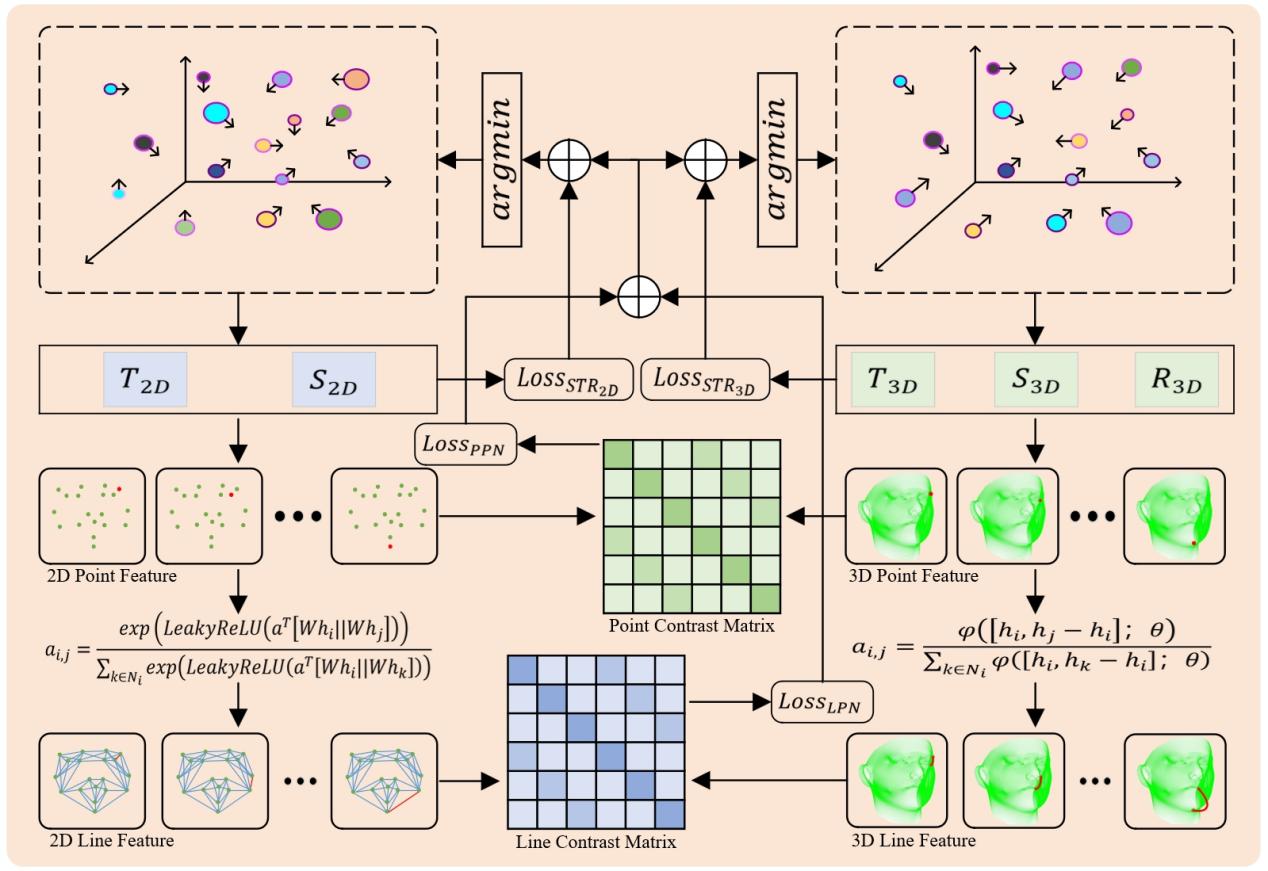 本文提出了一种新的具有区域和差分感知机制的特征金字塔网络,从RGB人脸图像中检测二维关键点,以提供平面信息,进而提高三维人脸重建的质量。在此基础上,构建粒子群优化的对比学习,通过二维和三维关键点的交替匹配,实现跨模态关键点重定位,将粒子群优化的全局搜索能力与对比学习的局部特征交互能力相结合,获得鲁棒结果。最后,提出了二阶双线性注意图卷积来纠缠多模态特征,利用多模态信息的互补性来增强面脸关键点的几何分布与头部姿态角度之间关系的探索能力。
