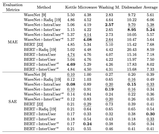 表1展示了基于WaveNet和BERT的电量分离模型在原始REFIT数据集及采用不同数据增强方法生成的数据集上所得到的MAE和SAE。总体而言,使用跨用户(inter-user)增强数据集训练的WaveNet模型取得了最佳的MAE表现,而使用同用户(intra-user)增强数据集训练的BERT模型则在SAE指标上表现最优。