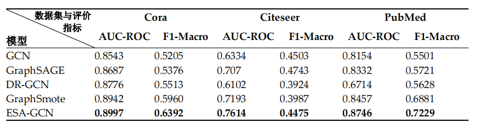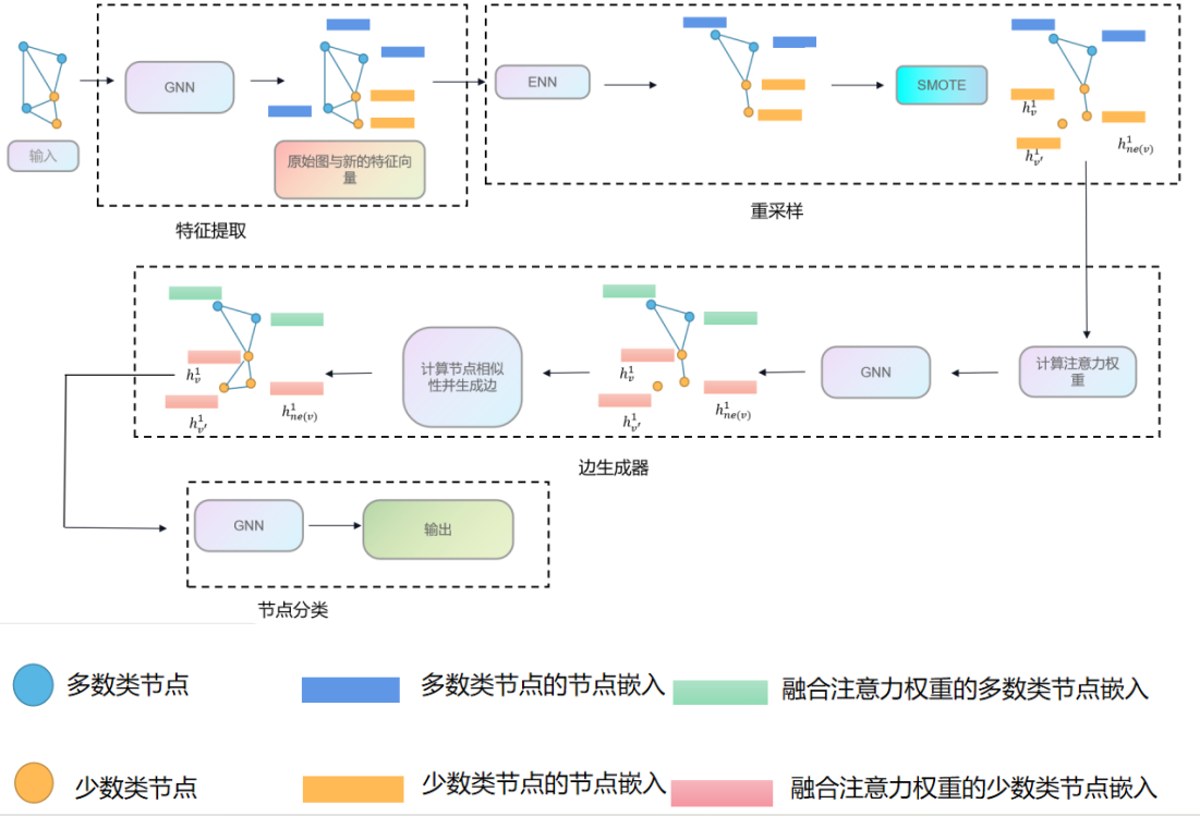 ESA-GCN能够充分利用图神经网络的特征提取能力和增强样本均衡的策略,提升在不平衡数据集上的节点分类效果。ESA-GCN的创新之处在于综合运用了欠采样、过采样和边缘生成技术,来提高不平衡图数据中的节点分类问题的解决能力。