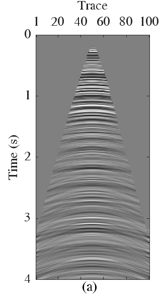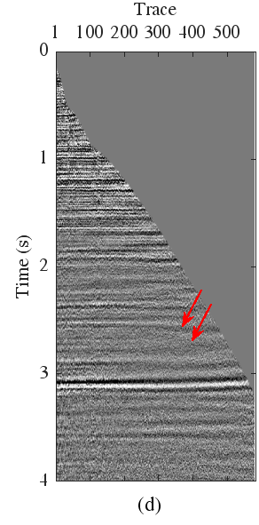 图7 (a)原数据。(b)-(d)分别是由常规PRT、高阶PRT和提出方法得到的多次波压制结果