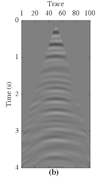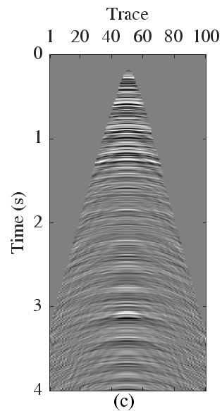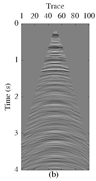 进一步将所有数据按照波到达时排序,如图7(a)所示,可见其中含有大量的多次波。经常规PRT多次波压制后,仍有多次波残差,如图7(b)所示。而高阶PRT和提出方法得到的一次波较干净,如图7(c)和(d)所示。表1为计算时间对比,显然,和具有保幅性的高阶PRT相比,本文方法用时更少。这说明,本文方法在多次波压制精度和效率方面都展现出了优势。