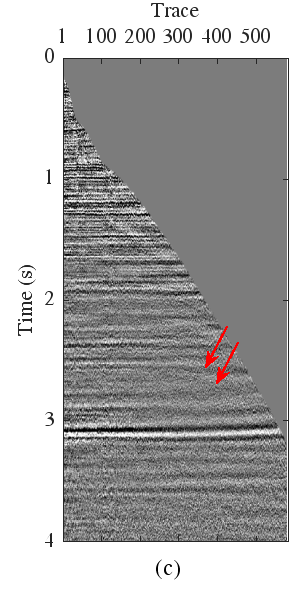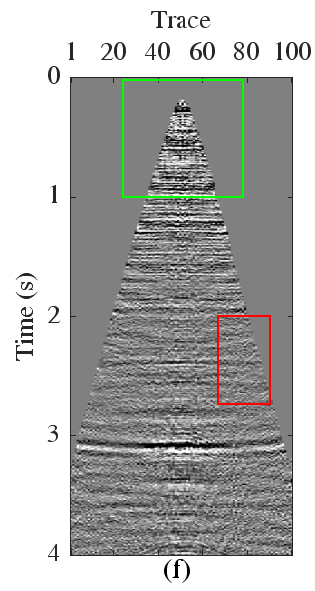 用常规PRT,已有的保幅高阶PRT和本文方法处理图3中的数据。图4(a)-(c)是第5个剖面的多次波估计结果。可见,常规PRT估计的多次波并不充分,导致图4(d)中仍有大量多次波残留;高阶PRT和本文方法估计的多次波能量更强,因此图4(e)和(f)中一次波更干净。