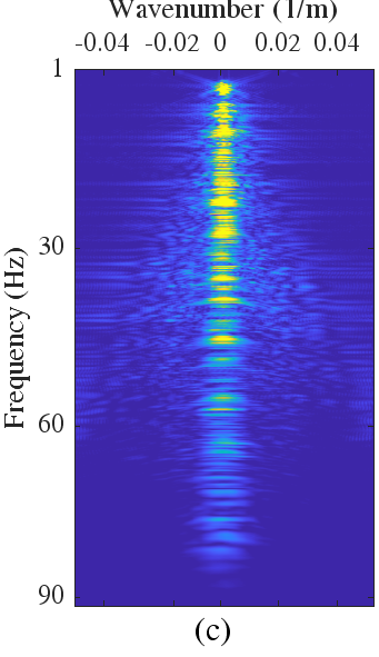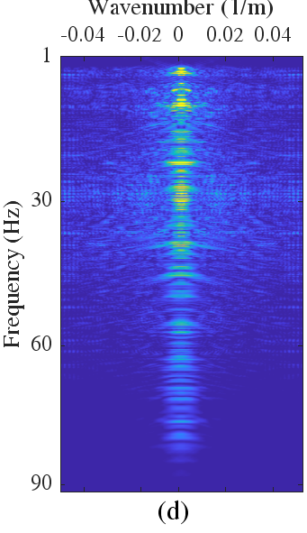 图5为从图4 (a)-(c)中提取的低频多次波。可见,本文方法估计的多次波振幅变化信息更丰富。为分析其原因,绘制原数据和三种方法估计多次波的FK谱如图6所示。不难发现,本文方法扫描的波数范围更大。说明增大曲率范围允许更多波数成分被扫描,有助于多次波估计。