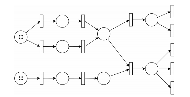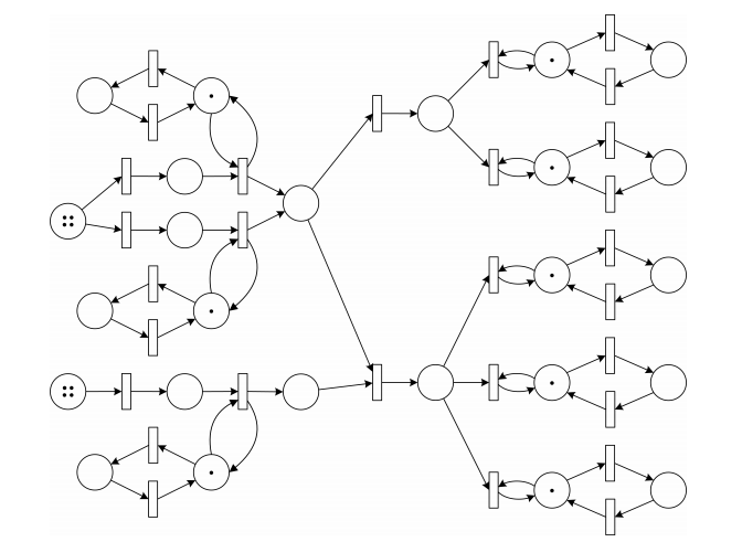 模型组成的基本思想是根据任务卸载模式将边缘模型“拼接”到云模型上。将边缘服务器的SPN模型中的“输出”位置拼接到云模型的“输入”位置。服务可以动态组合,服务选择可能发生在选择部署在云服务器上的适当服务,因此,来自边缘站点的请求可以被调度到特定的云服务器,得到一个最佳策略。图中展示了复合模型的示例: