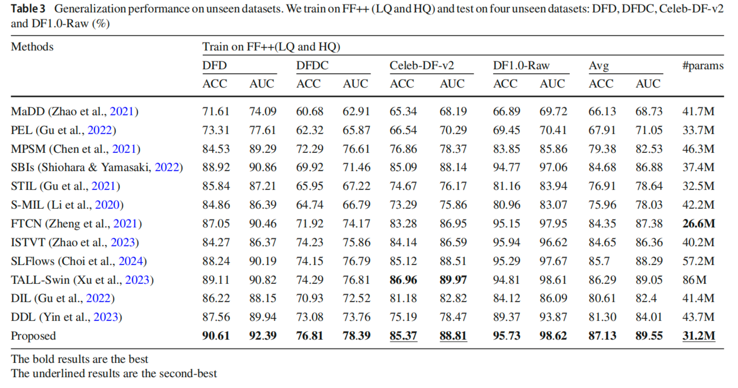 另外,在四个时空伪造数据集上进行了跨数据集检测实验,模型在所有评估指标方面都取得了更好的表现,如下图。