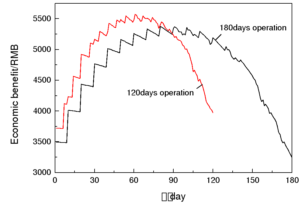Fig. 1. Optimal economic benefit curve of 120 and 180 days operation.