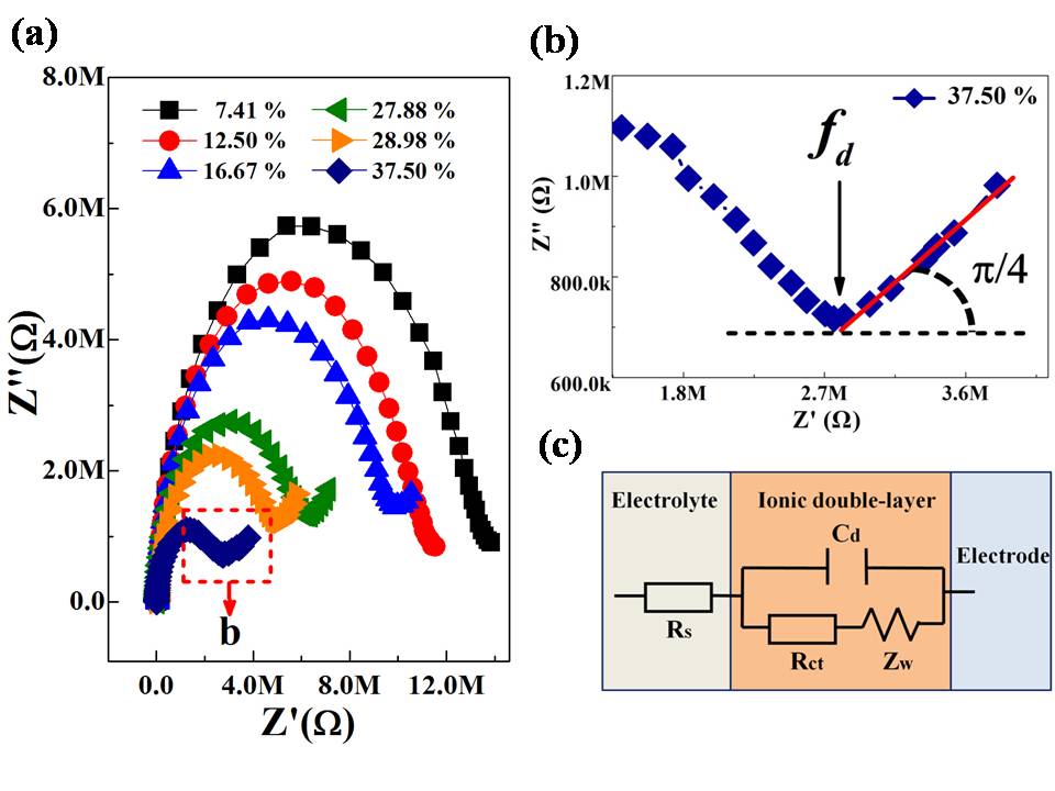 图2 (a)不同含水率乳状液的Nyquist图; (b)37.5%含水率乳状液在低频段的Nyquist细节图; (c) W/O型乳状液的等效电路模型