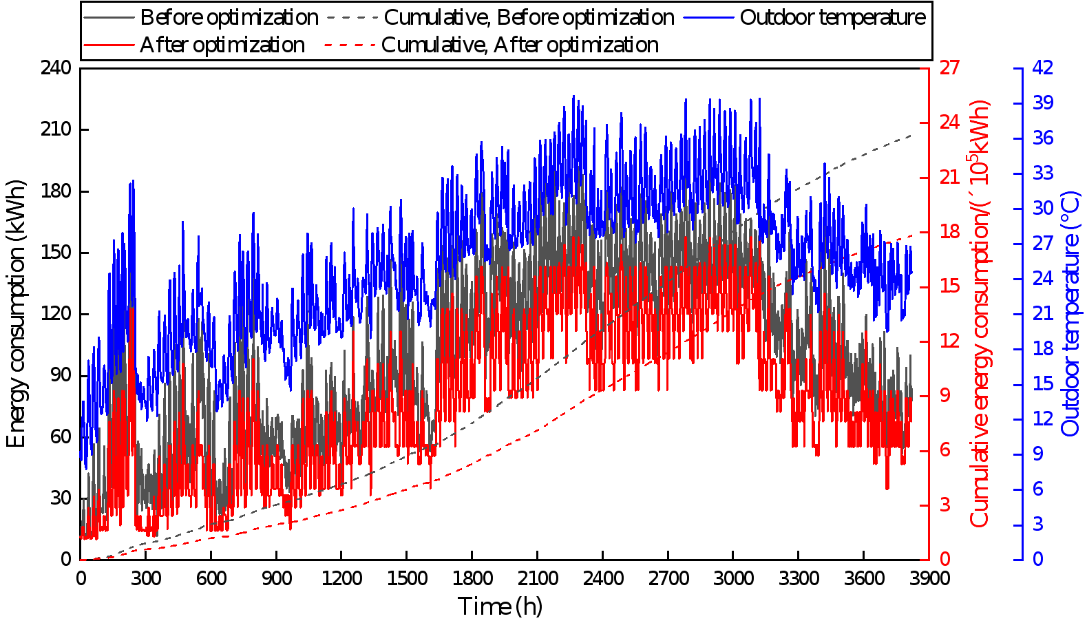 如图6所示,实施该数字孪生方案后,共节约电能5.5161 × 105 kWh,占总能耗的23.63%。