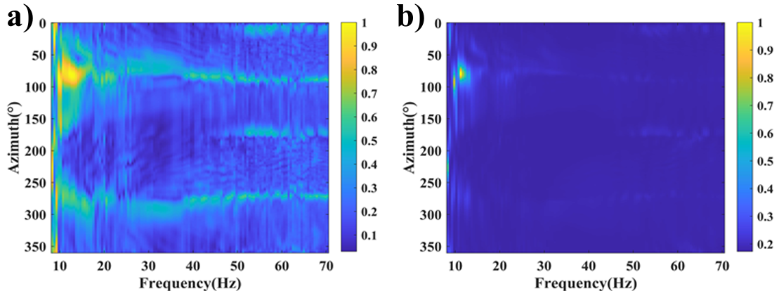 将上述的三维张量沿速度方向进行叠加,得到频率-方位谱。其中,谱峰值处对应的方位作为噪声源的主导方位。