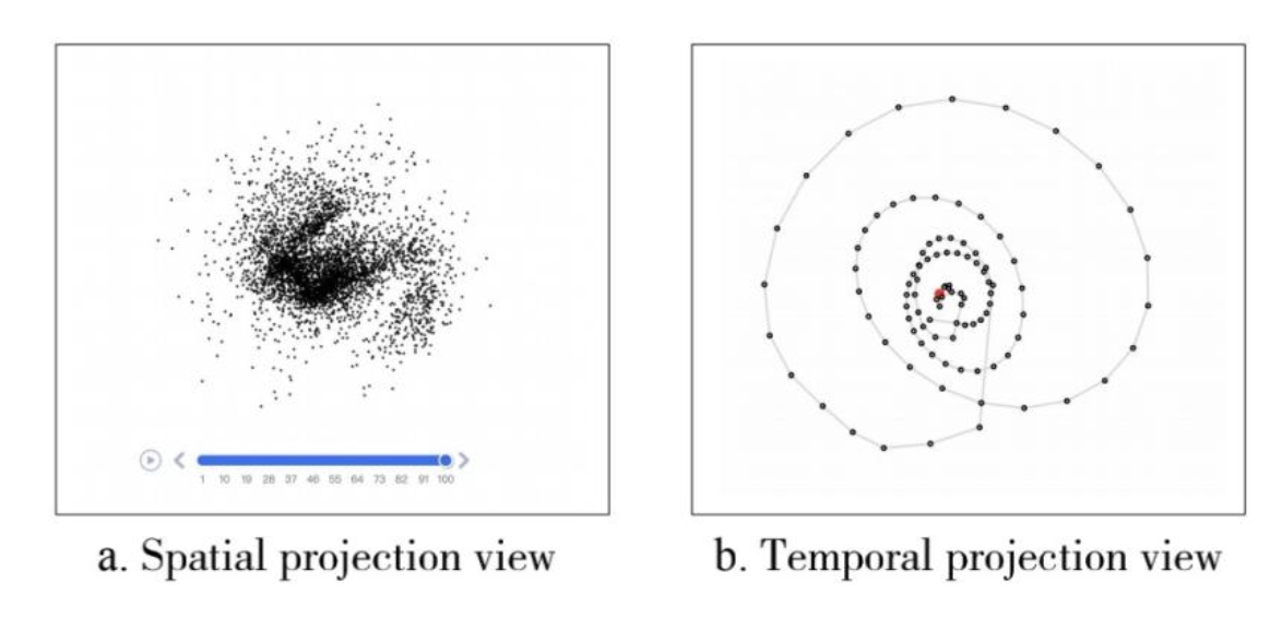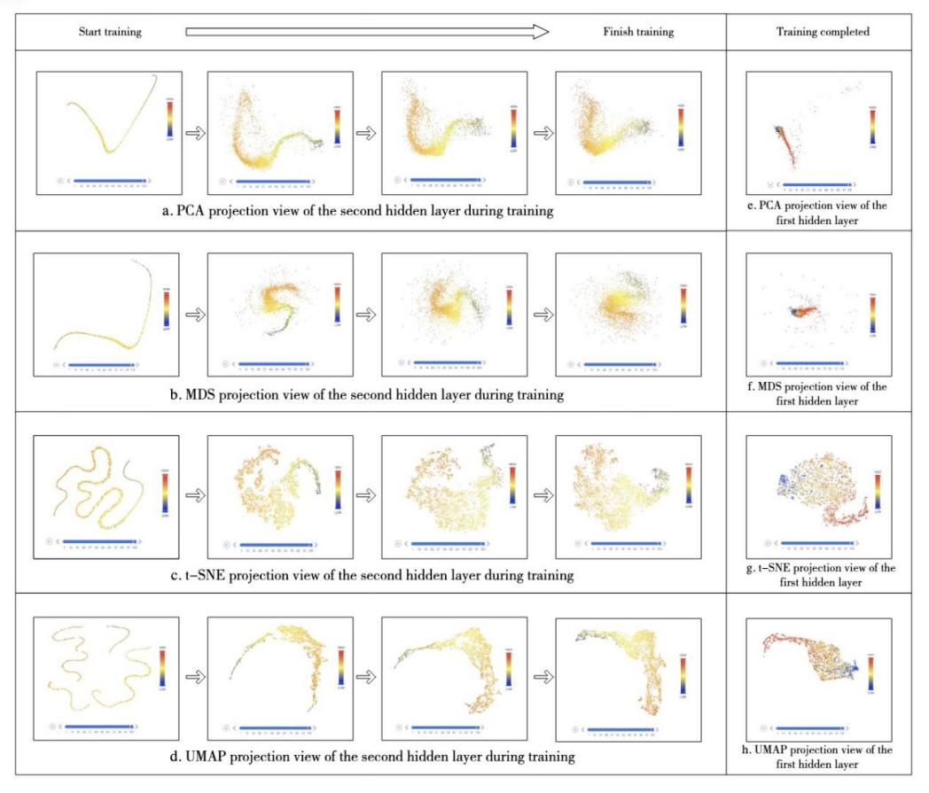 为了能够全面有效地将降维结果进行可视化,本文设计了空间投影和时序投影两种视图。分析人员可根据不同的分析任务选取不同分段下隐藏层激活状态,将其输入到DR中,然后再将二维空间下的投影结果映射到相应视图中进行探索和分析。