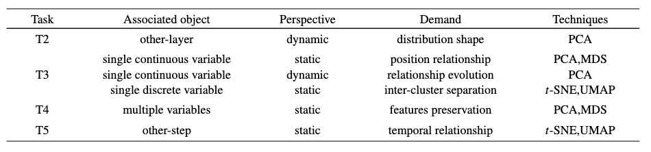 基于上述实验结果,本文提炼了在LSTM隐藏层可视分析任务中选择DR时必须考虑的几个重要因素,包括任务的关联对象、分析视角以及模式探索需求,并对它们适用的DR技术进行了总结,如表2所示。