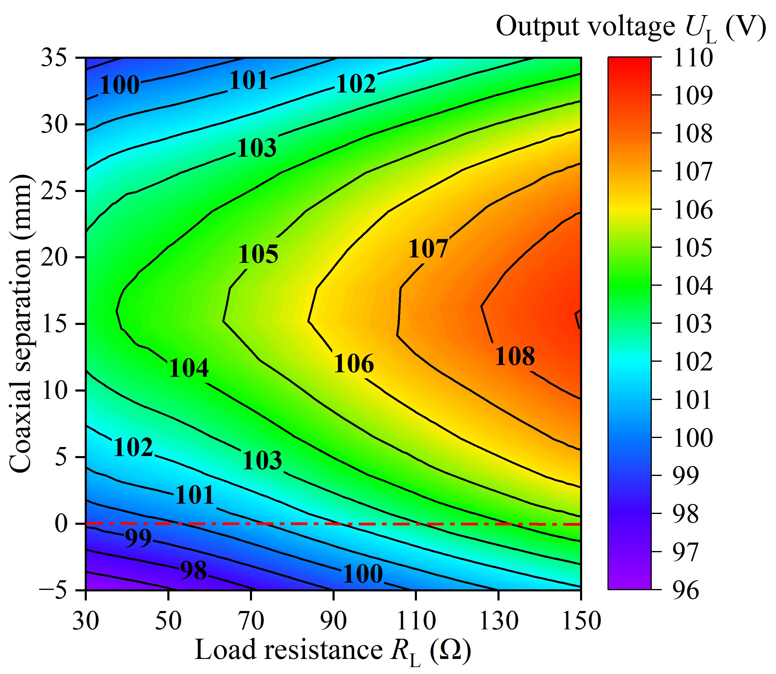 图5为负载电压UL随线圈分离和负载变化的曲线。本文提出的旋转式WPT系统在极端情况下电压变化范围为13.4%,参照国际标准EN 61000-3-3:2013和中国标准GB/T 12326-2008,该值在要求的±7%的标准限值内。图6为效率变化曲线,整体系统的平均效率为90.1%,在磁耦合机构偏移和负载变化情况下系统仍能保持高效稳定的电力输出。