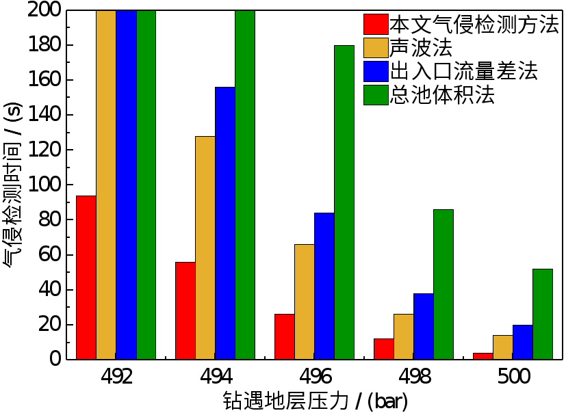 对比其他三种方法的检验统计量变化显著程度,该方法远大于其他检测方法,可有效避免误报警。此外,为充分说明本文气侵早期检测方法的有效性,对比分析了不同气侵程度下四种检测方法的气侵检测时间。