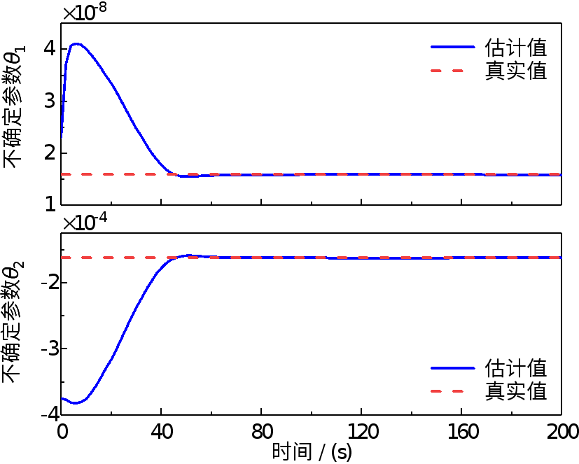 图4仿真结果表明:不确定参数均能在60s内收敛至真实值,收敛速度快且估计结果准确。由图5仿真结果可知:在气侵工况下,本文所提自适应观测器能够使估计值在60s内跟踪上正在变化的井底压力和出口流量,且后续的估计误差几乎为0,体现了观测器良好的跟踪性能。自适应观测器在60s时对气体体积的估计误差为0.21m3,在120s时估计误差缩小至0.15m3,在180s后估计误差几乎为0。表明本文所提自适应观测器在不确定参数给定初值与真实值相差较大时,仍能将不确定参数收敛至真实值。自适应观测器对井筒内气体体积的估计效果良好,估计误差能够保持在很小的区间内并持续缩小至0。