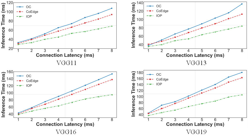 我们针对VGG11、VGG13、VGG16和VGG19,测试了设备间通信连接建立时间从1毫秒到8毫秒情况下的推理延迟。对于VGG11网络,使用IOP的推理延迟减少了14.51%至26.74%。而对于VGG13、VGG16和VGG19,IOP方案的推理延迟分别减少了12.99%至24.99%、3.34%至31.01%和15.01%至34.87%。