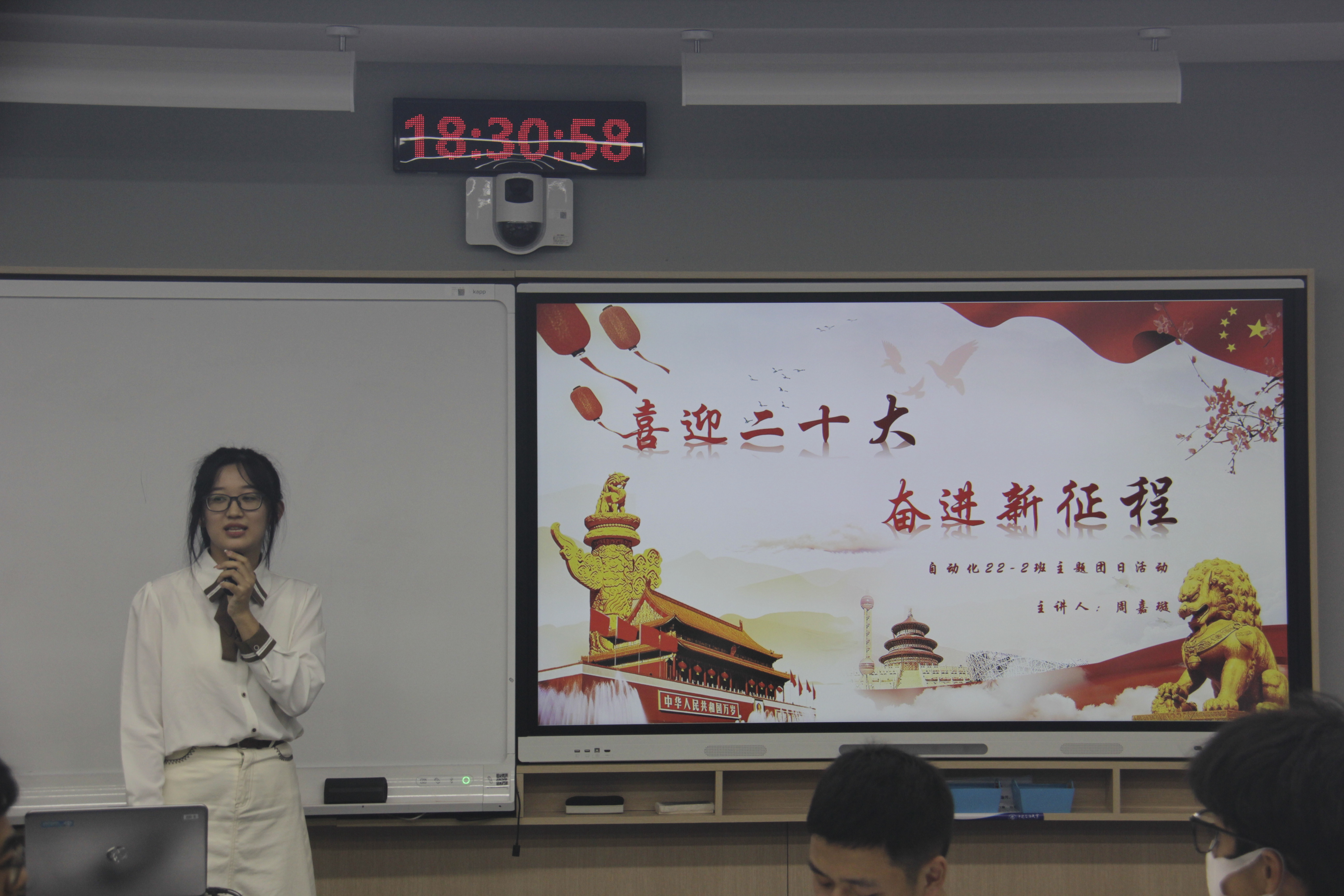 首先,学院电子19-1团支部书记周嘉璇与自动化22-2团支部全体团员共同带来了“喜迎二十大 奋进新征程”主题团日示范课。她运用重温誓词、理论讲解、知识竞答、游戏互动等常用活动形式,生动的演示了如何举办一个有团味的团日活动。