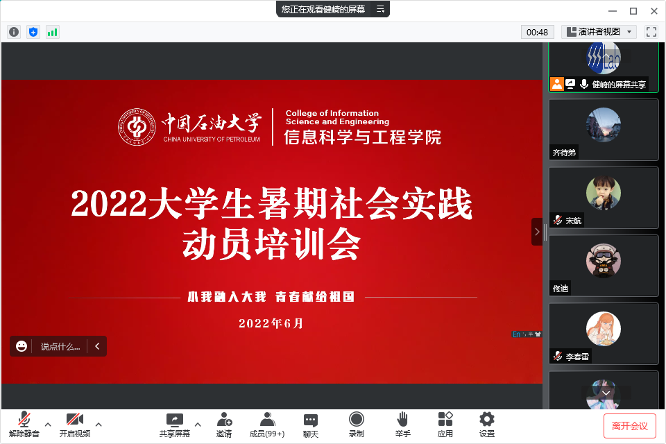 为引导学生在暑期积极投身实践、服务社会,提高学院2022年大学生暑期社会实践活动质量,6月3日,信息学院召开暑期社会实践线上培训会,学院团委书记代莉莎、各年级辅导员及100余名学生参加会议,2020级辅导员赵健崎主持会议。