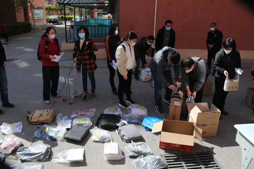 4月11日上午8点,活动正式开始。在经过查验证件、测温和手部消毒后,7组教师分赴校园主楼、阳光公寓、汇才公寓和润杰公寓的6个学生工作室和54间宿舍,逐一同学生电话或视频连线确定物品位置。不少学生的宿舍都在五楼和六楼,取的物品也有台式机和大量书籍等,教师们一层一层地爬上去,再找完物品抬到快递处,已是满头大汗。在集中快递现场,教师们核对地址信息,协助快递员将物品一一打包称重,并在下午1点前将所有快递包裹全部送出。