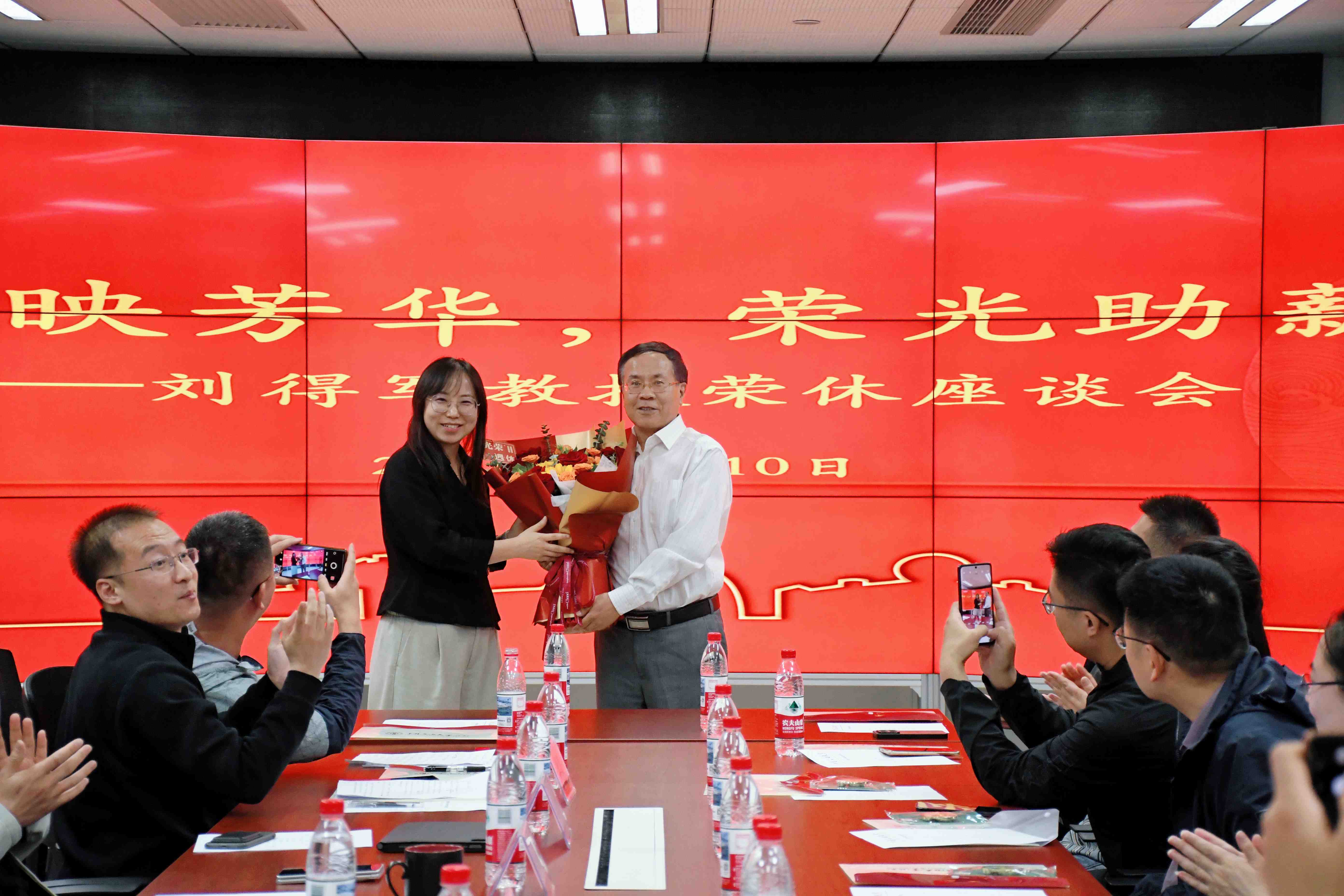 座谈会上,林伯韬代表学院向刘得军教授赠送了退休纪念盘和纪念品,校友代表为刘得军教授送上鲜花,表达学生最真挚的祝福。