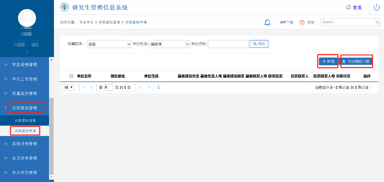 教师登录研究生管理信息系统,选择实践基地管理,实践基地申请,点击新增。