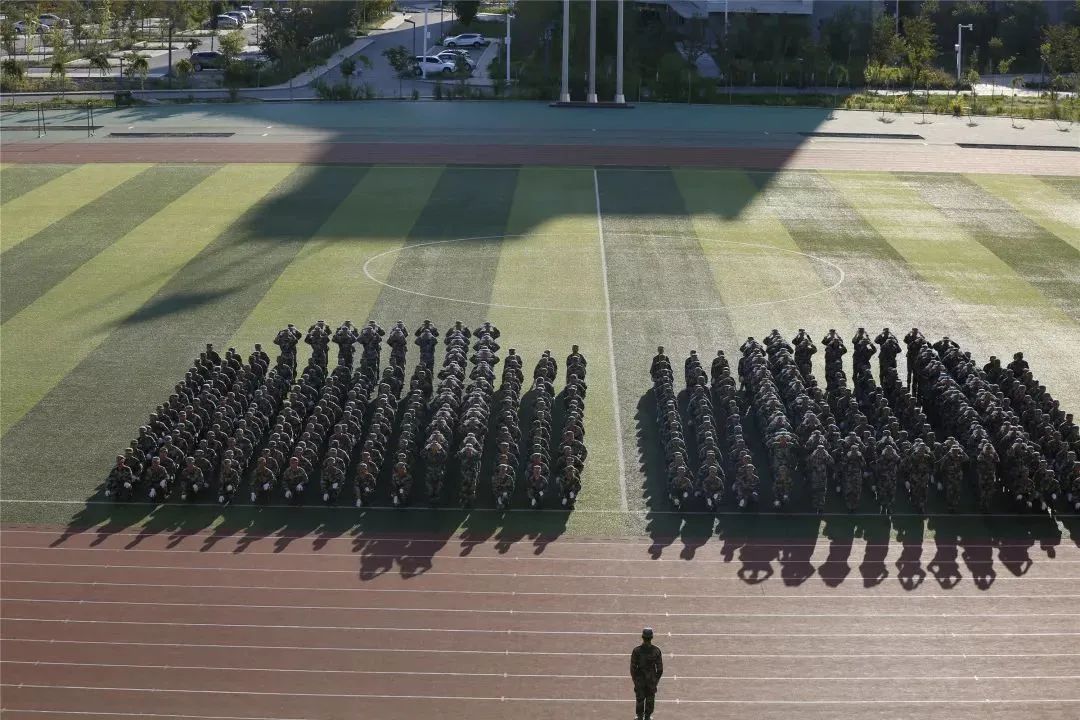 在克拉玛依校区的红旗操场上新生认真参加入学军训